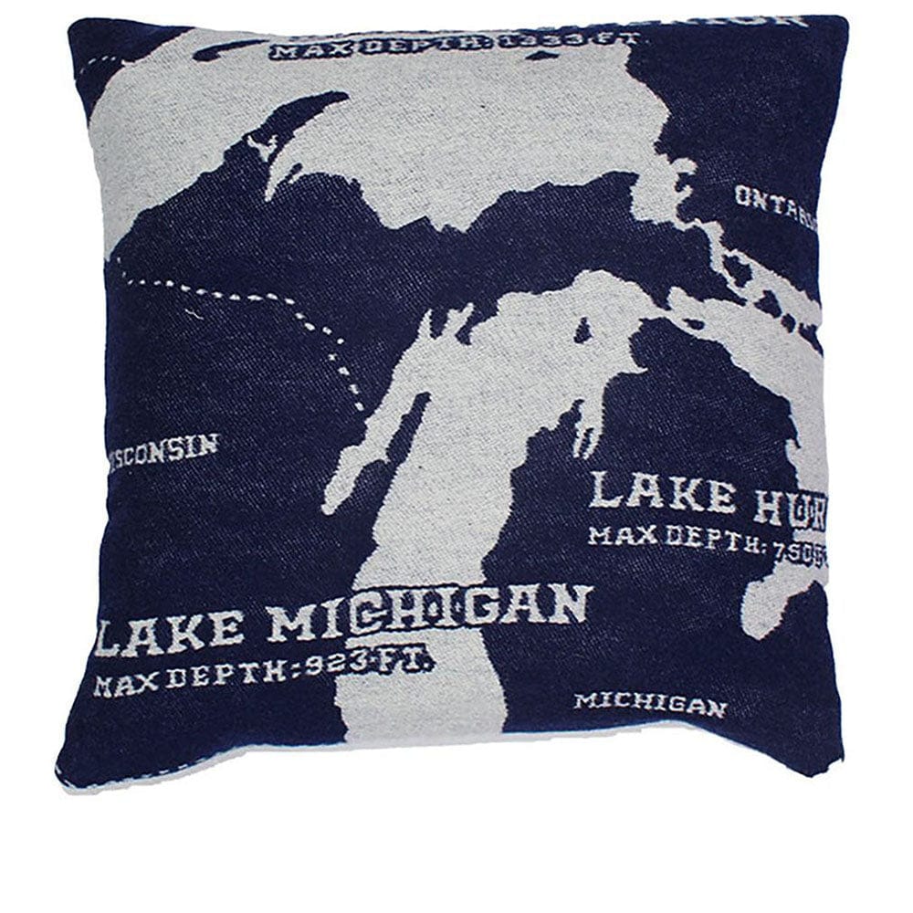 Map of the Great Lakes woven with wool. Consisting of 6 quadrillion gallons of water, the 5 Great Lakes contain about 84% of the surface freshwater in North America & border 8 US States. Our map pillow of the Great Lakes is made in the USA of soft wool yarns. Perfect for anyone who loves the Great Lakes.